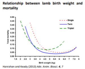 Different areas of the country, different farms and different breeds of ewes will of course feel the impact in different ways, but anecdotal stories would suggest ewes are dropping body condition more rapidly than ideal for this time of year, meaning the general recommendation is ewes should start to be feed quicker than usual, to prevent a rapid decline in body condition, to maintain good lamb growth and viability. This graph shows the link between lamb birth weight and mortality: